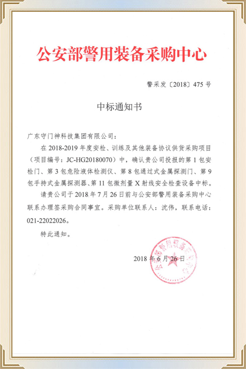公安部警用裝備采購中心中標通知書