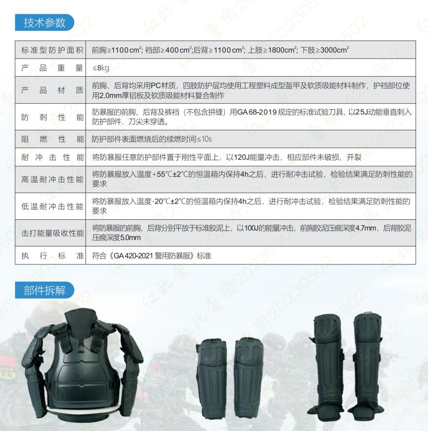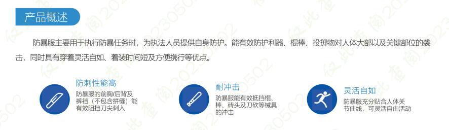 防暴服主要用于執(zhí)行防暴任務(wù)時(shí),為執(zhí)法人員提供自身防護(hù)。能有效防護(hù)利器、棍棒、投擲物對(duì)人體大部以及關(guān)鍵部位的襲擊,同時(shí)具有穿著靈活自如、著裝時(shí)間短及方便攜行等優(yōu)點(diǎn)。