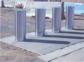 這種可自動升降式防撞柱能夠在短時間內通過遙控設施實現自動升降,鋼柱體完全降下時,路面暢通無阻,防撞柱升起后,對車輛進行阻攔,鋼柱體底座和外套筒都在地下,通過傳力作用,把中央柱體所受的沖擊力和彎矩傳到地基里。